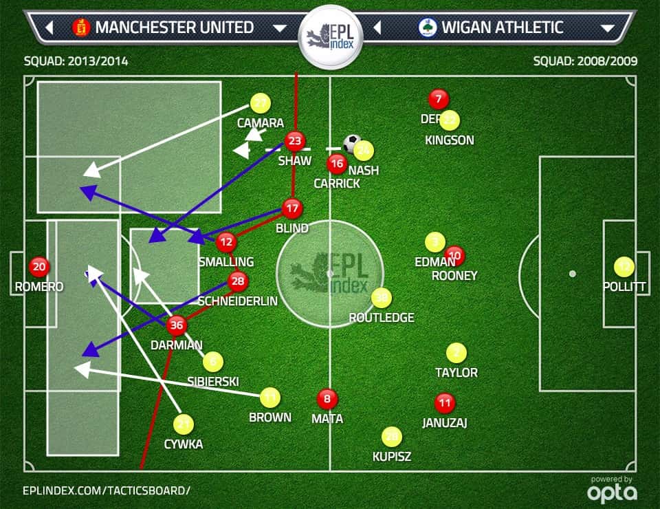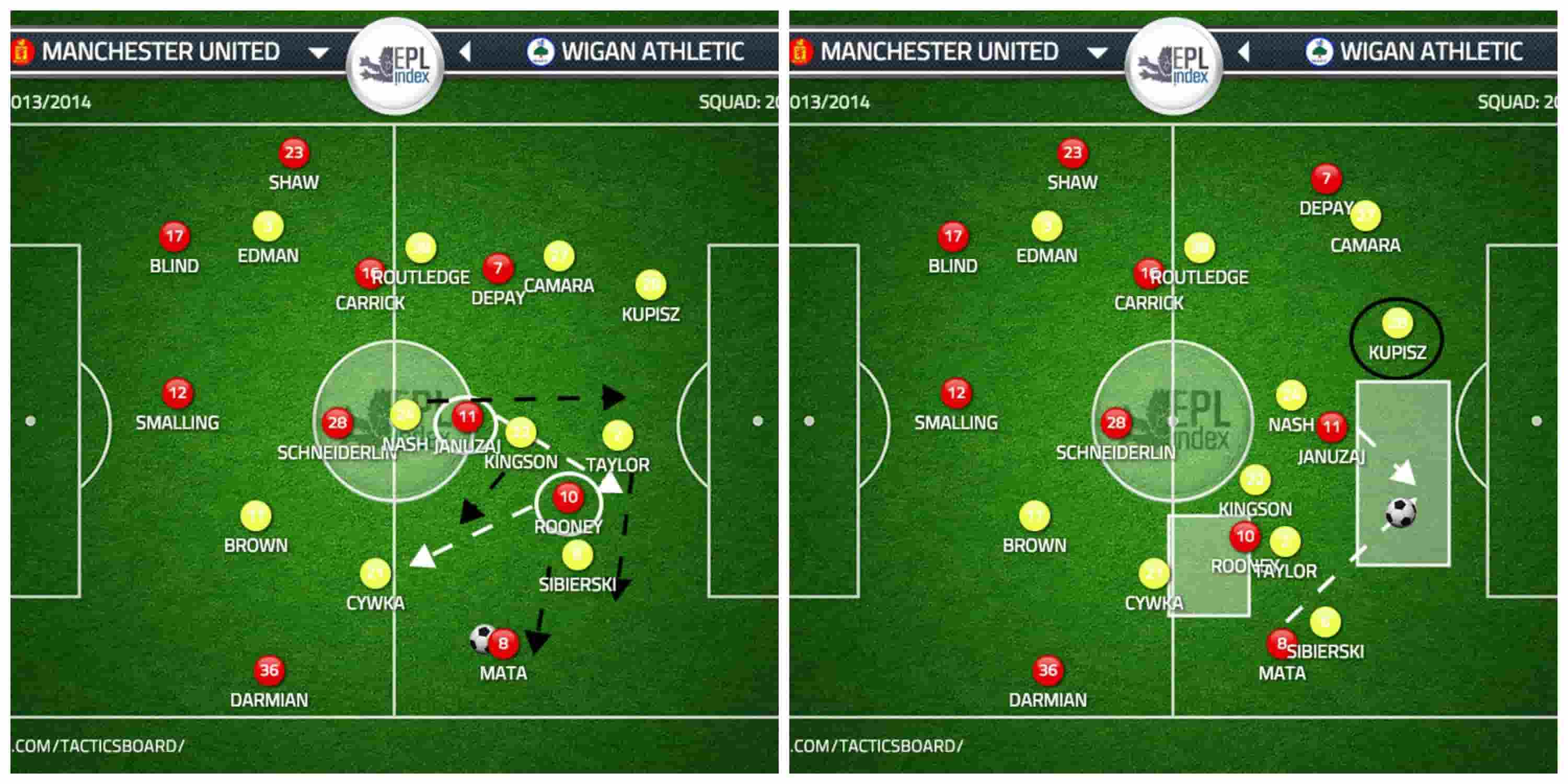 More importantly, and somewhat of a mistake in this instance, had Rooney pulled out wide onto the United Left wing completely it would have created space for Shaw to make an unmarked run through into a goal scoring position of which Januzaj, Mata & Schneiderlin could have also been part of.