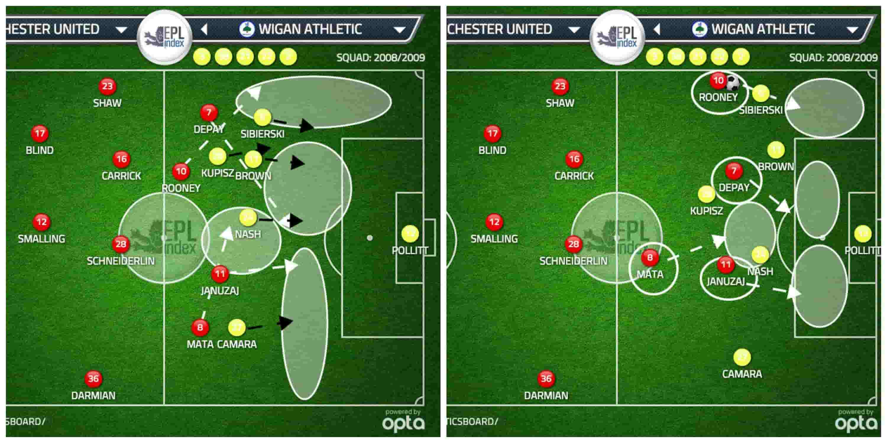 4) Ultimately It's Mata's movement that causes the goal, the Spaniard recognises the deeper positioning of the LCB and LB and uses the resulting space to draw the RCB closer to him.
