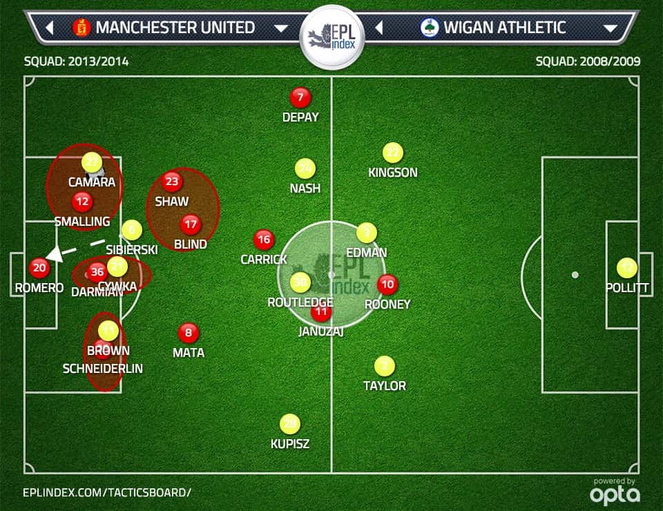 Had Darmian and Schneiderlin made runs up the right wing and right inside zone respectively the likelihood would have resulted in a greater scoring opportunity than what had previous arisen. The lack of movement from the 6 out field players in the Manchester United half would have been concerning in this move.
