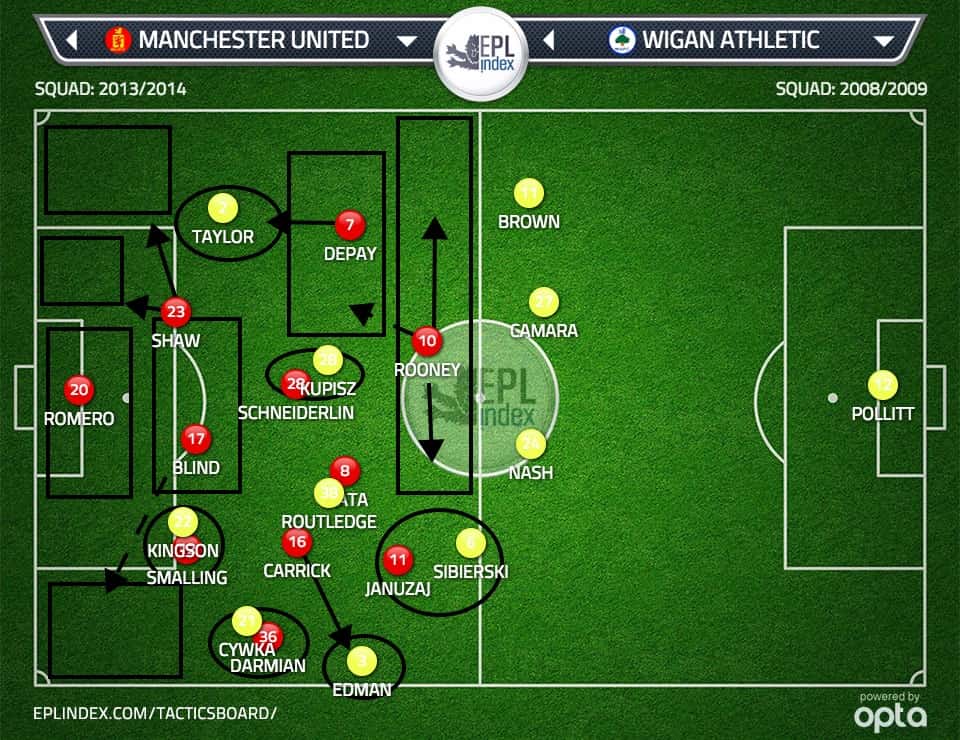 In an almost triangle like system Rooney drifted out to the left, Januzaj pushed up top and Depay came into a deep central role where the shot was blazed over.